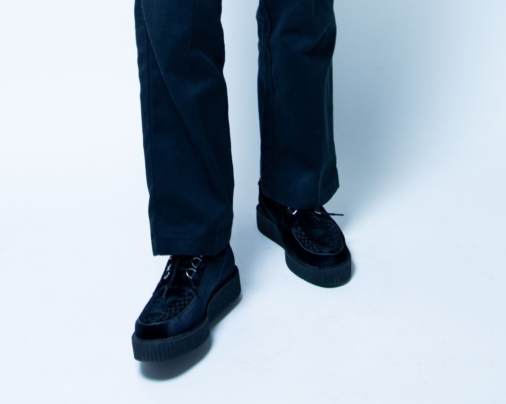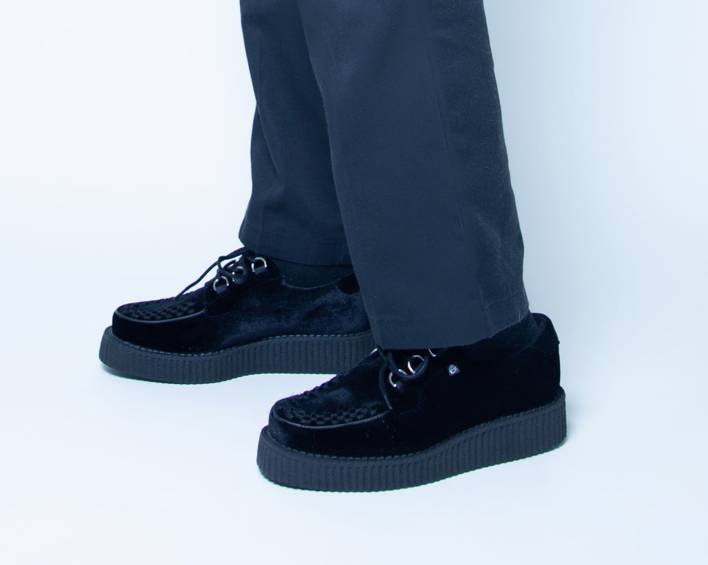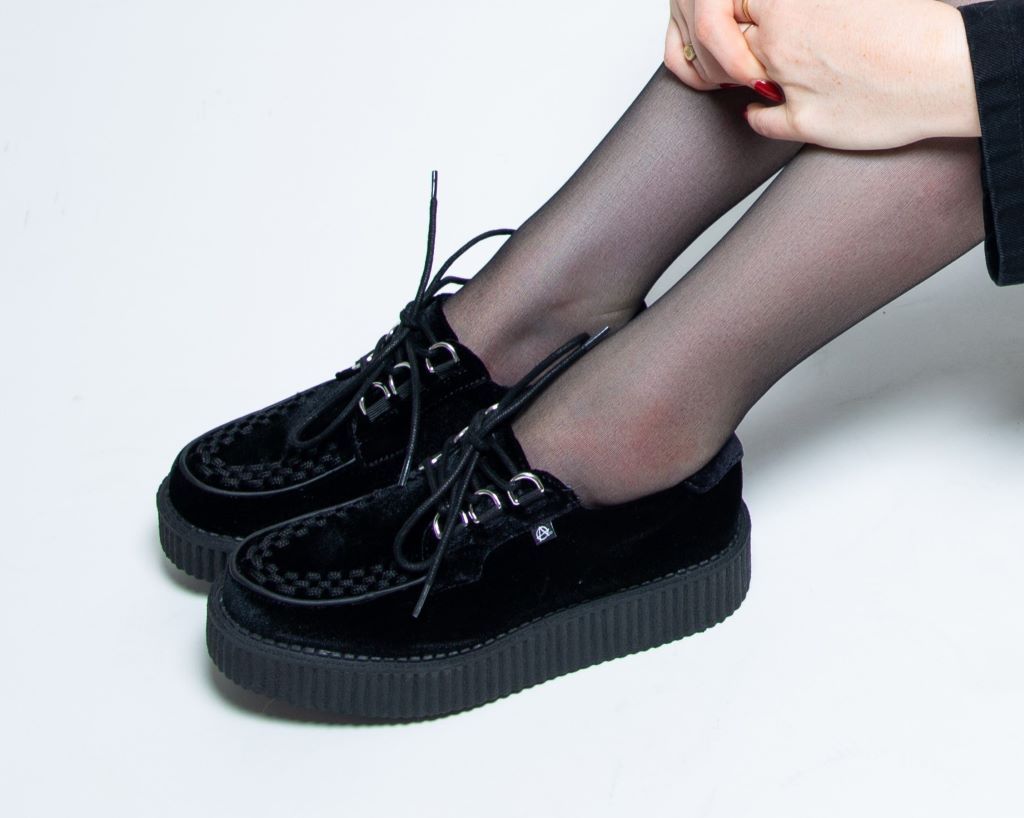Step into Anarchic Creepers — a twist on our crowd favorite classic round toe creeper featuring our old school ’91 TPR sole! Features a vegan friendly, black velvet upper with 3 D-ring lace up fastening. Has twill lining, foam padding insole, and a low sole creeper platform that measures 1 ½” at the heel and ¾” in the front.
